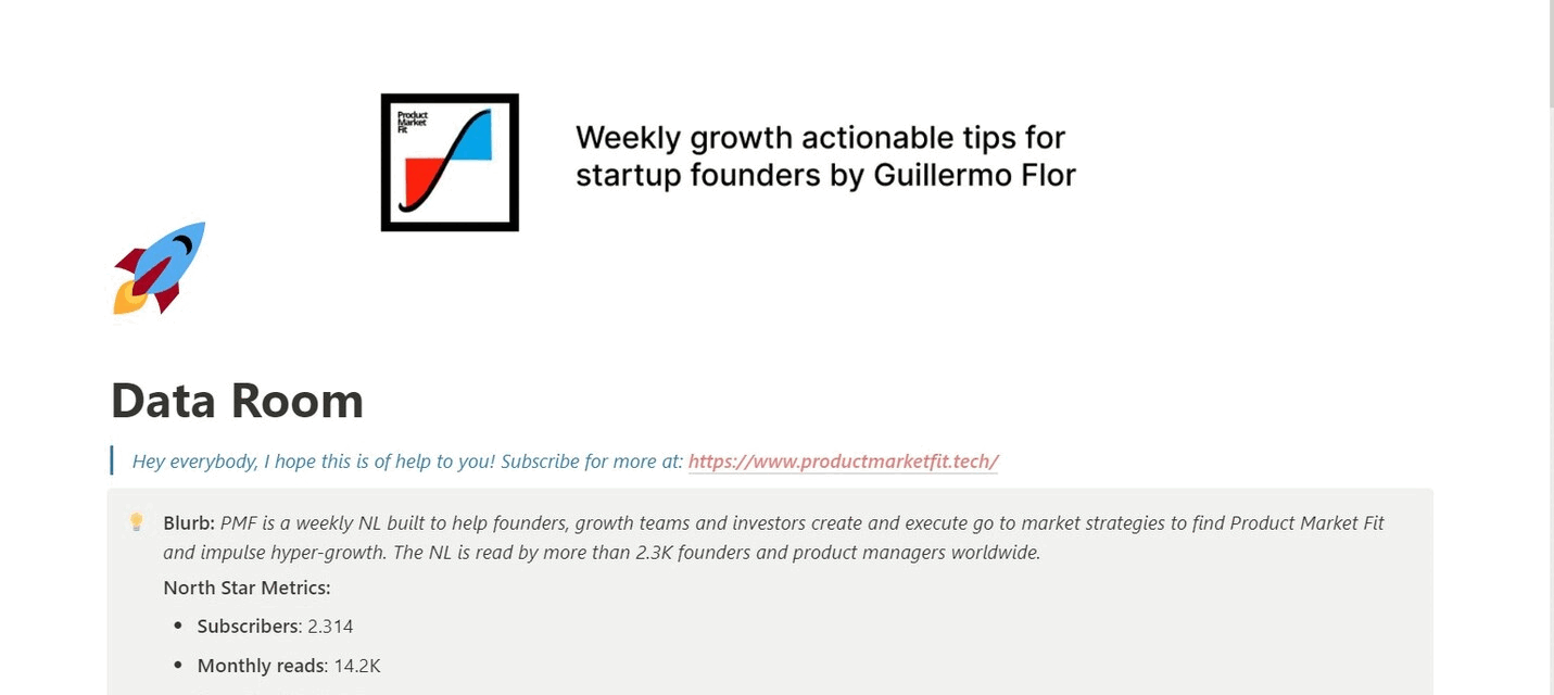 This data room template shares all the information investors are looking for in any startup and how to display it. The template uses a concept startup (Product Market Fit).